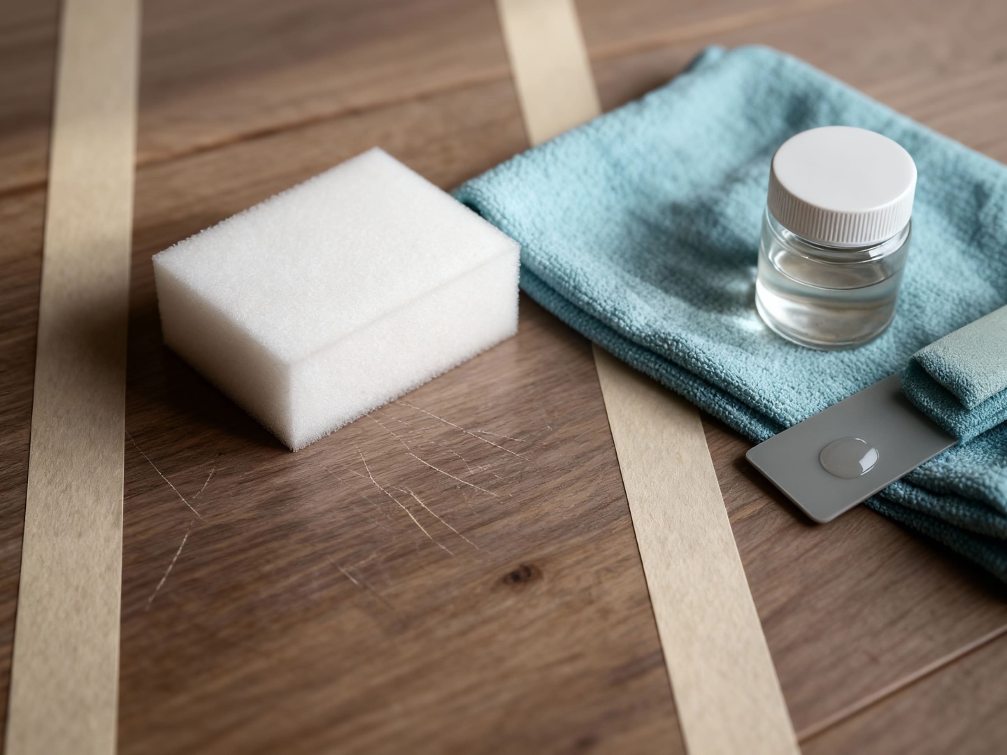 3.     Меламиновые губки. Меламиновая губка является универсальным инструментом для удаления загрязнений и мелких царапин с различных материалов, включая кварцвинил. Эти губки содержат меламин, который, благодаря своей абразивной структуре, эффективно счищает грязь и восстанавливает поверхность. Для достижения максимального эффекта губку следует слегка смочить водой и аккуратно тереть поврежденный участок. Такой метод подходит для легких царапин и может быть использован без дополнительных химикатов;